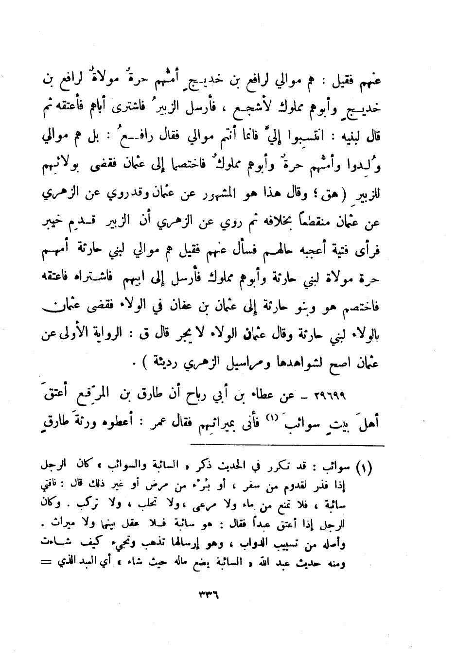 29699- عن عطاء بن أبي رباح أن طارق بن المرقع أعتق أهل بيت سوائب1 فأتى بميراثهم فقال عمر: أعطوه ورثة طارق