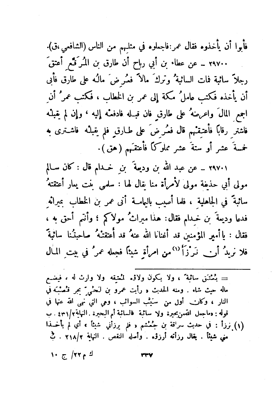 29700- عن عطاء بن أبي رباح أن طارق بن المرقع أعتق رجلا سائبة فمات السائبة وترك مالا فعرض ماله على طارق فأبى أن يأخذه فكتب عامل مكة إلى عمر بن الخطاب، فكتب عمر أن اجمع المال واعرضه على طارق فإن قبله فادفعه إليه، وإن لم يقبله فاشتر رقابا فأعتقهم قال فعرض على طارق فلم يقبله فاشترى به خمسة عشر أو ستة عشر مملوكا فأعتقهم. "هق".