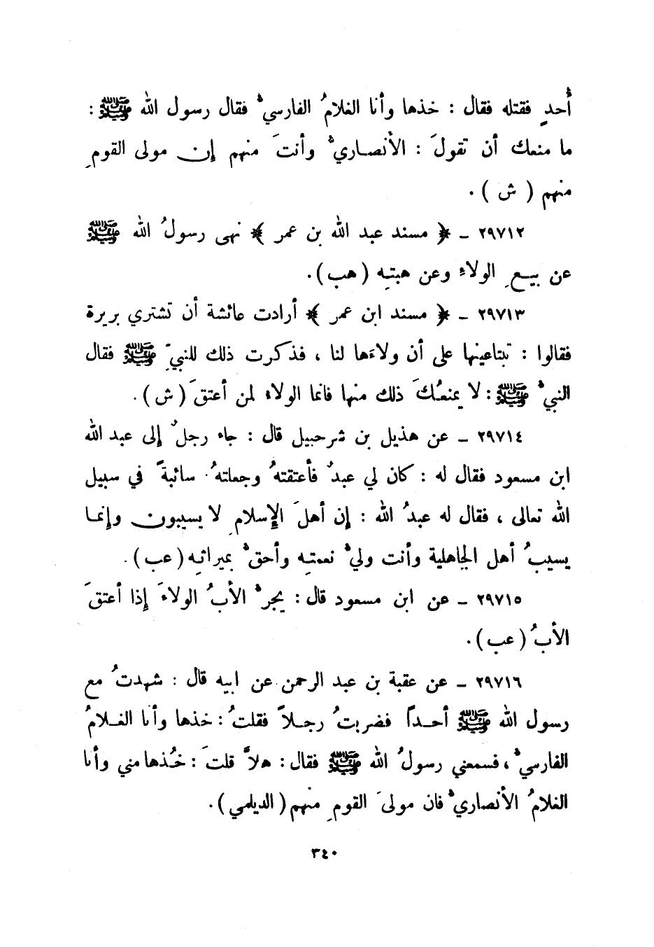 29713- "مسند ابن عمر" أرادت عائشة أن تشتري بريرة فقالوا: تبتاعينها على أن ولاءها لنا، فذكرت ذلك للنبي صلى الله عليه وسلم فقال النبي صلى الله عليه وسلم: "لا يمنعك ذلك منها فإنما الولاء لمن أعتق". "ش".