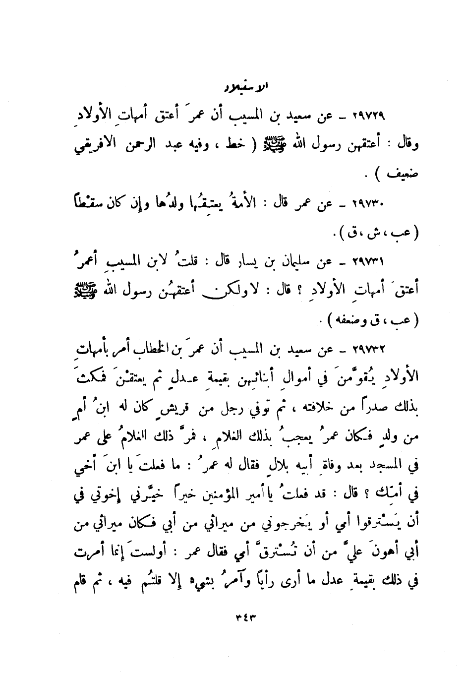 29731- عن سليمان بن يسار قال: قلت لابن المسيب أعمر أعتق أمهات الأولاد؟ قال: لا ولكن أعتقهن رسول الله صلى الله عليه وسلم. "عب، ق" وضعفه.