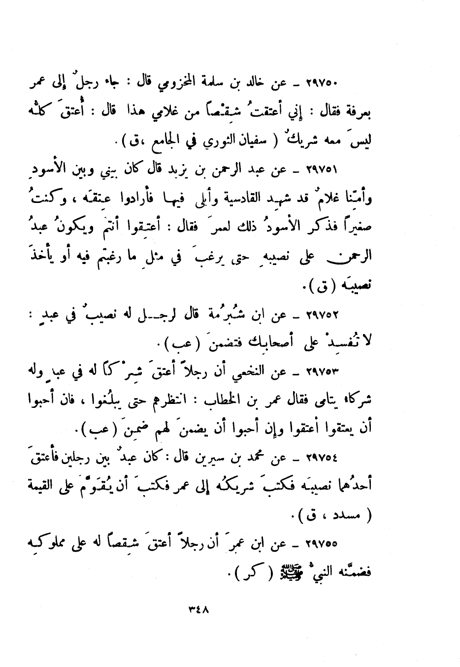 29750- عن خالد بن سلمة المخزومي قال: جاء رجل إلى عمر بعرفة فقال: إني أعتقت شقصا من غلامي هذا قال: أعتق كله ليس معه شريك. سفيان الثوري في الجامع، "ق".