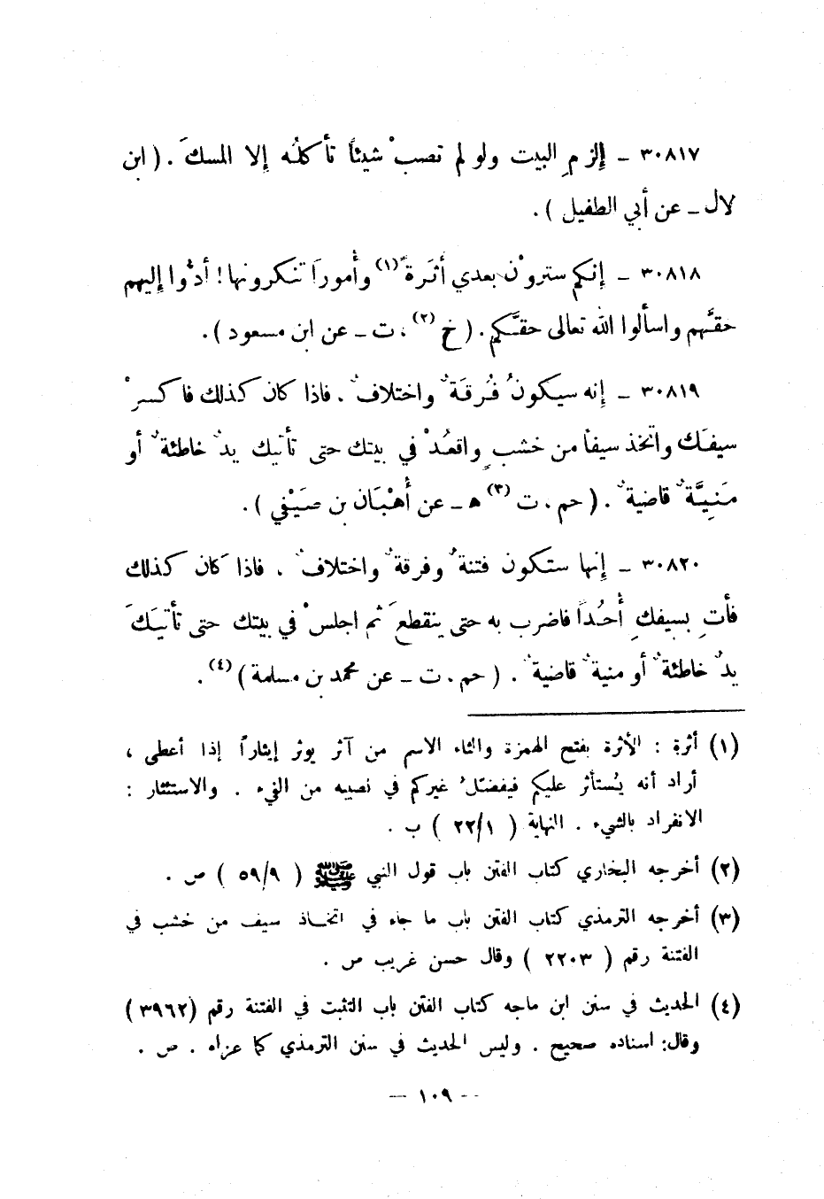 3 أخرجه الترمذي كتاب الفتن باب ما جاء في اتخاذ سيف من خشب في الفتنة رقم "2203" وقال حسن غريب. ص.