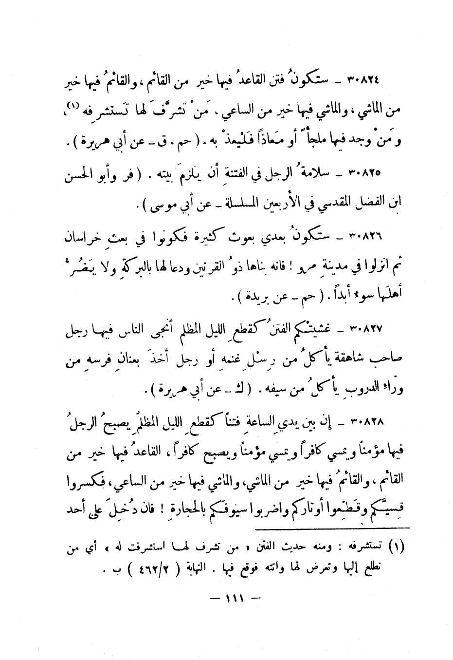 30824- ستكون فتن القاعد فيها خير من القائم، والقائم فيها خير من الماشي، والماشي فيها خير من الساعي، من تشرف لها تستشرفه 1، ومن وجد فيها ملجأ أو معاذا فليعذ به. "حم، ق - عن أبي هريرة".