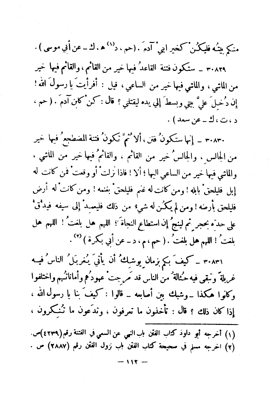 30829- ستكون فتنة القاعد فيها خير من القائم، والقائم فيها خير من الماشي، والماشي فيها خير من الساعي، قيل: أفرأيت يا رسول الله! إن دخل علي بيتي وبسط إلي يده ليقتلني؟ قال: كن كابن آدم. "حم، د، ت، ك - عن سعد".