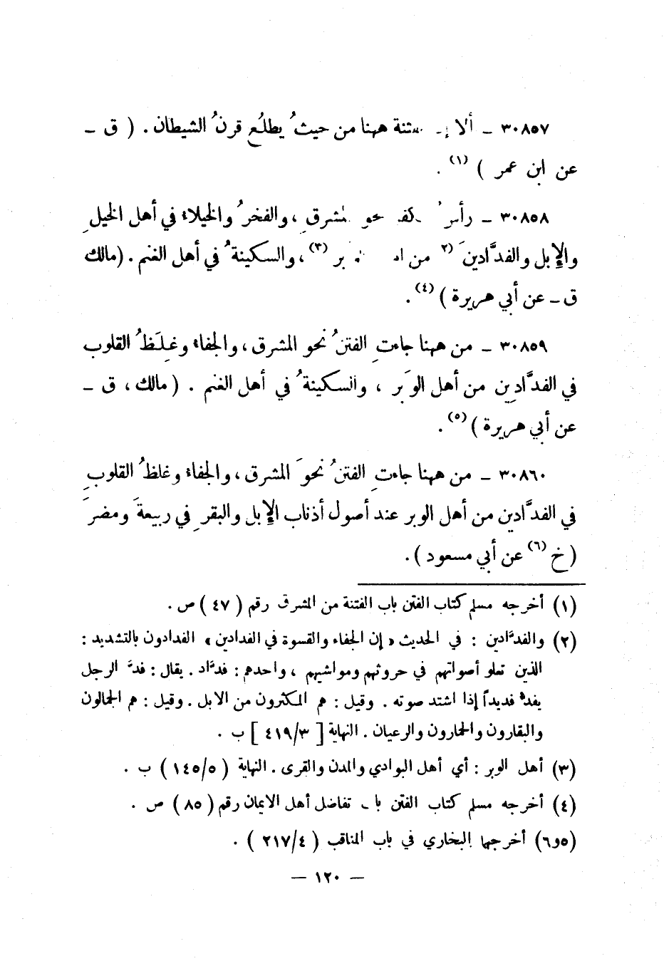 30859- من ههنا جاءت الفتن نحو المشرق، والجفاء وغلظ القلوب في الفدادين من أهل الوبر، والسكينة في أهل الغنم. "مالك، ق - عن أبي هريرة"5.