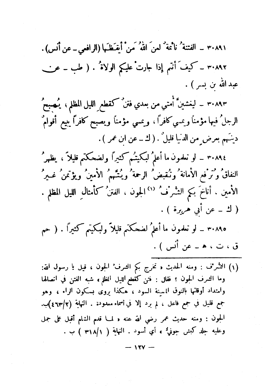 30894- لو تعلمون ما أعلم لبكيتم كثيرا ولضحكتم قليلا، يظهر النفاق وترفع الأمانة وتقبض الرحمة ويتهم الأمين ويؤتمن غير الأمين، أناخ بكم الشرف 1 الجون، الفتن كأمثال الليل المظلم. "ك - عن أبي هريرة".