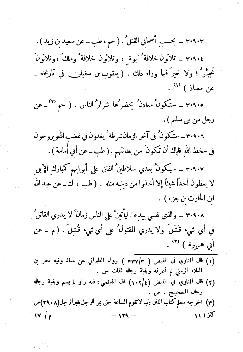 30908- والذي نفسي بيده! ليأتين على الناس زمان لا يدري القاتل في أي شيء قتل ولا يدري المقتول على أي شيء قتل. "م - عن أبي هريرة"3.