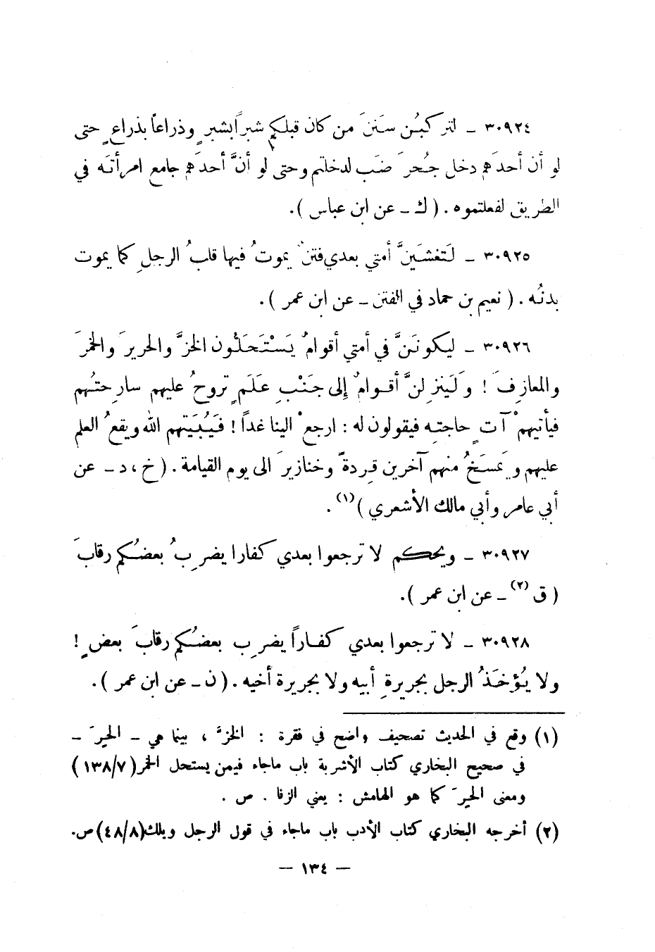 30927- ويحكم لا ترجعوا بعدي كفارا يضرب بعضكم رقاب. "ق 2 - عن ابن عمر".