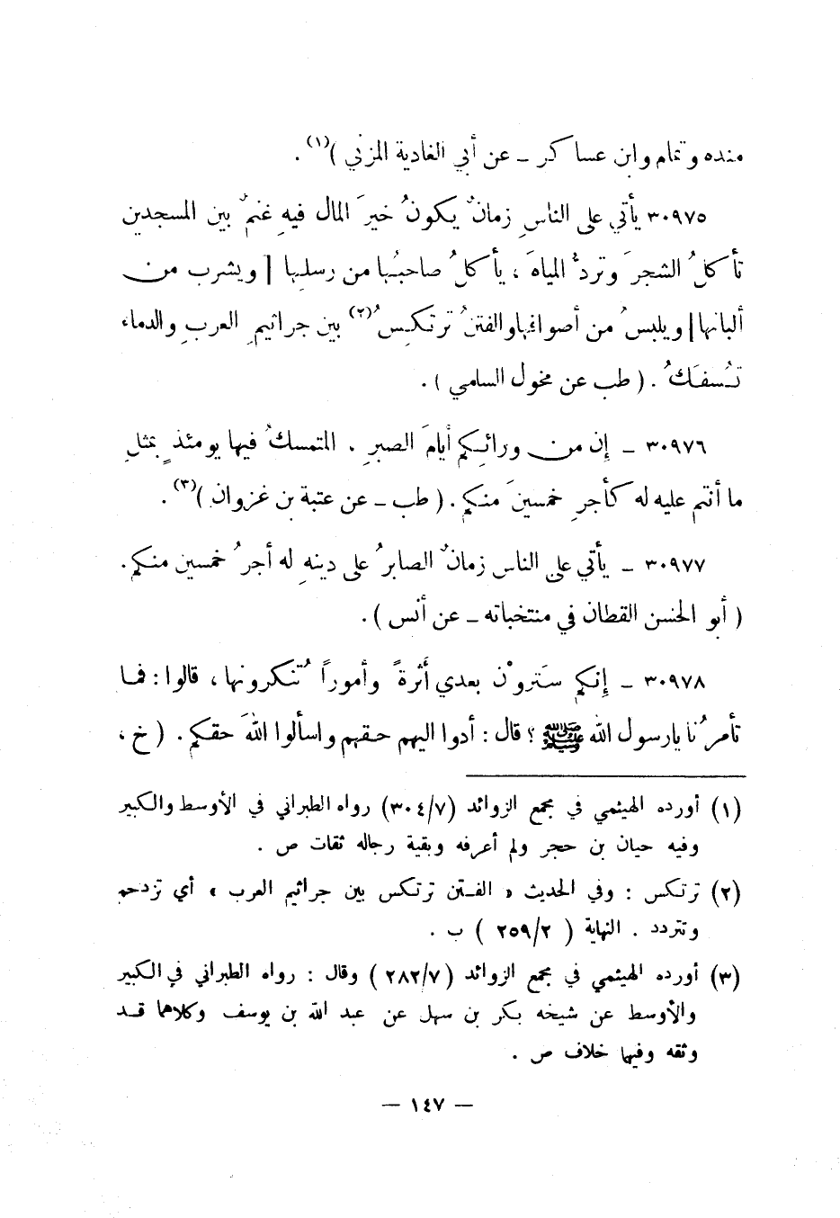 30976- إن من ورائكم أيام الصبر، المتمسك فيها يومئذ بمثل ما أنتم عليه له كأجر خمسين منكم. "طب - عن عتبة بن غزوان"3.