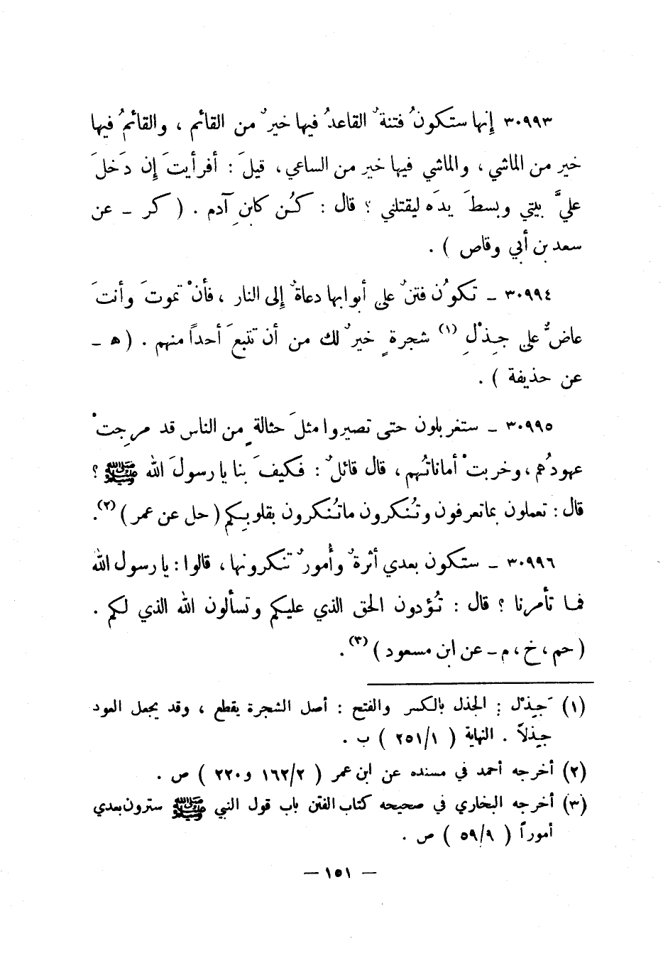 30994- تكون فتن على أبوابها دعاة إلى النار، فأن تموت وأنت عاض على جذل 1 شجرة خير لك من أن تتبع أحدا منهم. "هـ - عن حذيفة".