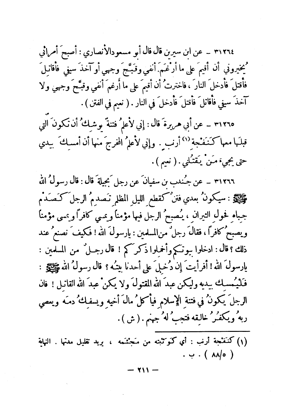 31265- عن أبي هريرة قال: إني لأعلم فتنة يوشك أن تكون التي قبلها معها كنفجة 1 أرنب. وإني لأعلم المخرج منها أن أمسك بيدي حتى يجيء من يقتلني. "نعيم".
