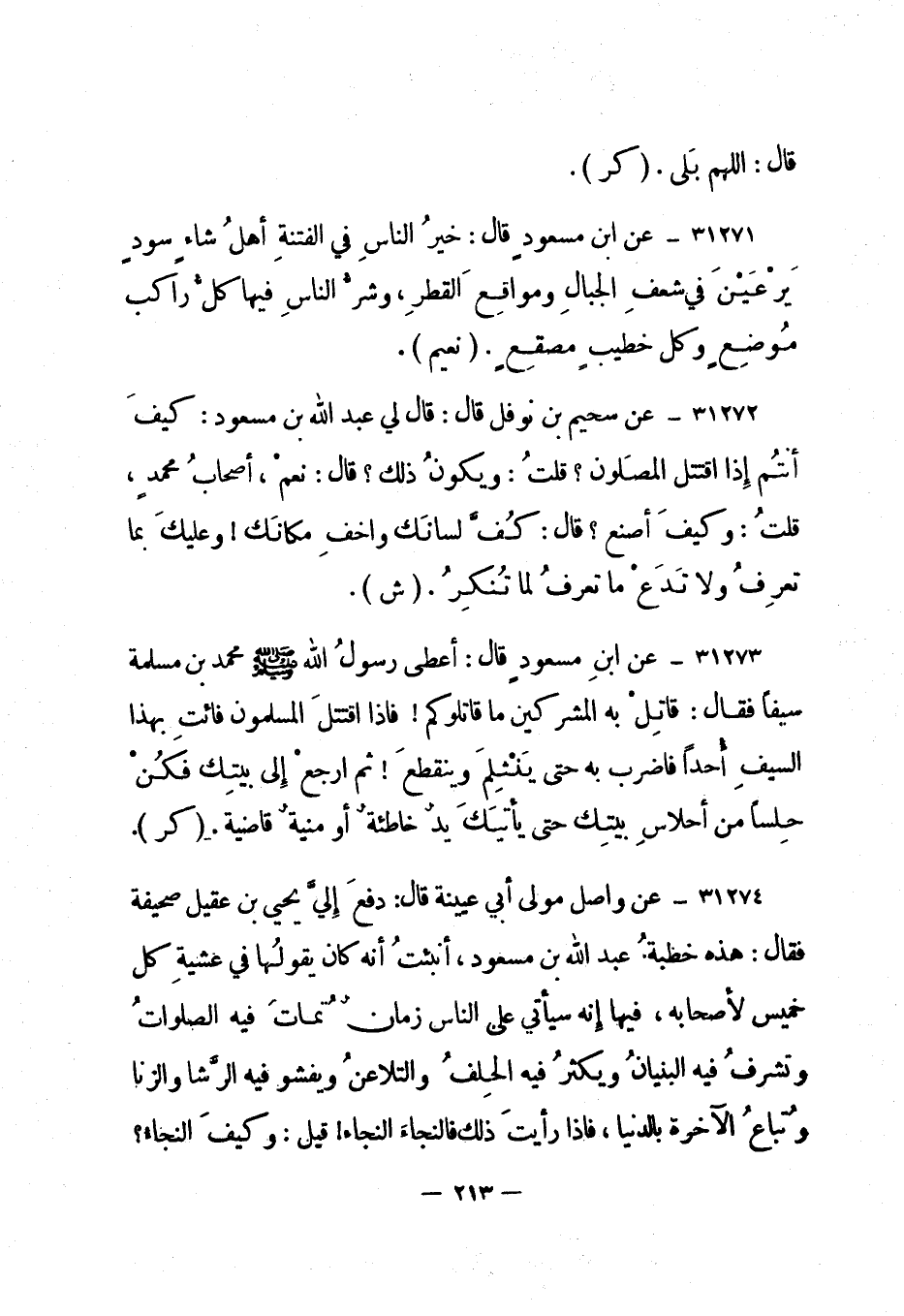 31273- عن ابن مسعود قال: أعطى رسول الله صلى الله عليه وسلم محمد بن مسلمة سيفا فقال: قاتل به المشركين ما قاتلوكم! فإذا اقتتل المسلمون فائت بهذا السيف أحدا فاضرب به حتى ينثلم وينقطع! ثم ارجع إلى بيتك فكن حلسا من أحلاس بيتك حتى يأتيك يد خاطئة أو منية قاضية. "كر".