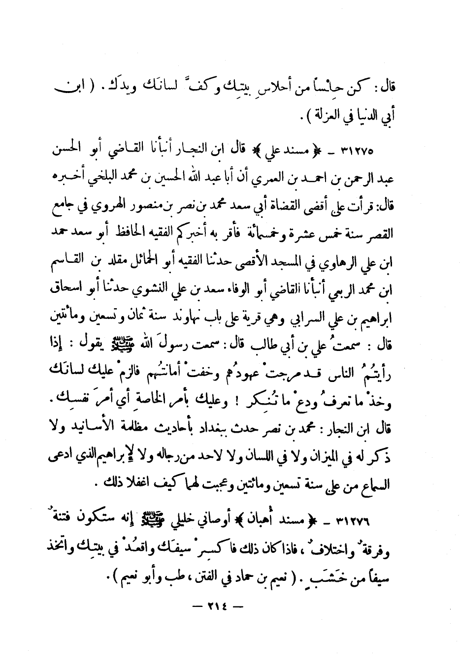 31275- "مسند علي" قال ابن النجار أنبأنا القاضي أبو الحسن عبد الرحمن بن أحمد بن العمري أن أبا عبد الله الحسين بن محمد البلخي أخبره قال: قرأت على أقضى القضاة أبي سعد محمد بن نصر بن منصور الهروي في جامع القصر سنة خمس عشرة وخمسمائة فأقر به أخبركم الفقيه الحافظ أبو سعد حمد ابن علي الرهاوي في المسجد الأقصى حدثنا الفقيه أبو الحمائل مقلد بن القاسم ابن محمد الربعي أنبأنا القاضي أبو الوفاء سعد بن علي النشوي حدثنا أبو إسحاق إبراهيم بن علي السرابي وهي قرية على باب نهاوند سنة ثمان وتسعين ومائتين قال: سمعت علي بن أبي طالب قال: سمعت رسول الله صلى الله عليه وسلم يقول: إذا رأيتم الناس قد مرجت عهودهم وخفت أمانتهم فالزم عليك لسانك وخذ ما تعرف ودع ما تنكر! وعليك بأمر الخاصة أي أمر نفسك. قال ابن النجار: محمد بن نصر حدث ببغداد بأحاديث مظلمة الأسانيد ولا ذكر له في الميزان ولا في اللسان ولا لأحد من رجاله ولا لإبراهيم الذي ادعى السماع من على سنة تسعين ومائتين وعجبت لهما كيف أغفلا ذلك.
