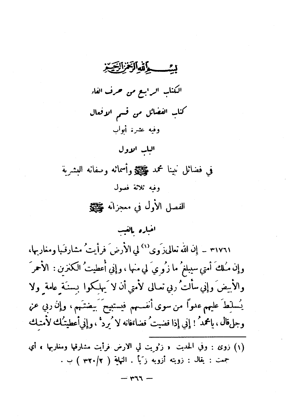 31761- إن الله تعالى زوى 1 لي الأرض فرأيت مشارقها ومغاربها، وإن ملك أمتي سيبلغ ما زوي لي منها، وإني اعطيت الكنزين: الأحمر والأبيض وإني سألت ربي تعالى لأمتي أن لا يهلكوا بسنة عامة ولا يسلط عليهم عدوا من سوى أنفسهم فيستبيح بيضتهم، وإن ربي عز وجل قال، يا محمد! إني إذا قضيت قضاء فإنه لا يرد، وإني أعطيتك لأمتك