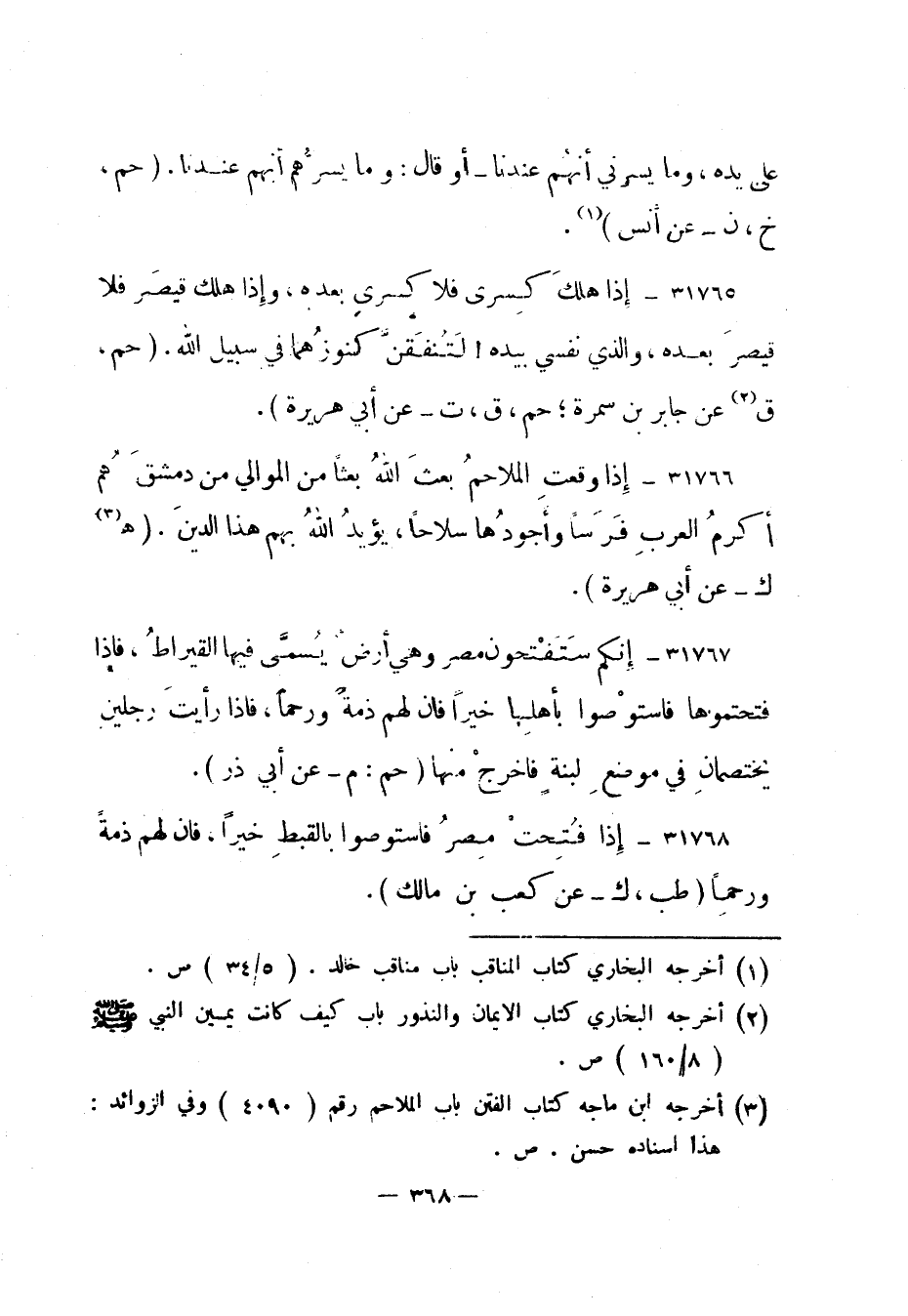 31766- إذا وقعت الملاحم بعث الله بعثا من موالي من دمشق هم أكرم العرب فرسا وأجودها سلاحا، يؤيد الله بهم هذا الدين. "هـ 3 ك - عن أبي هريرة".