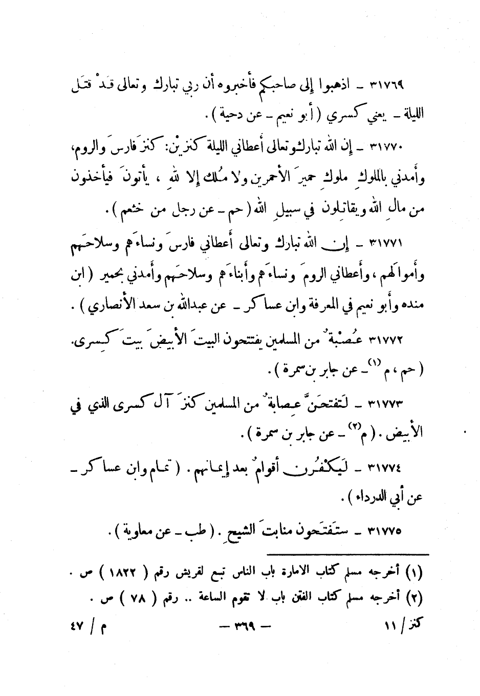 31773- لتفتحن عصابة من المسلمين كنز آل كسرى الذي في الأبيض. "م 2 - عن جابر بن سمرة".