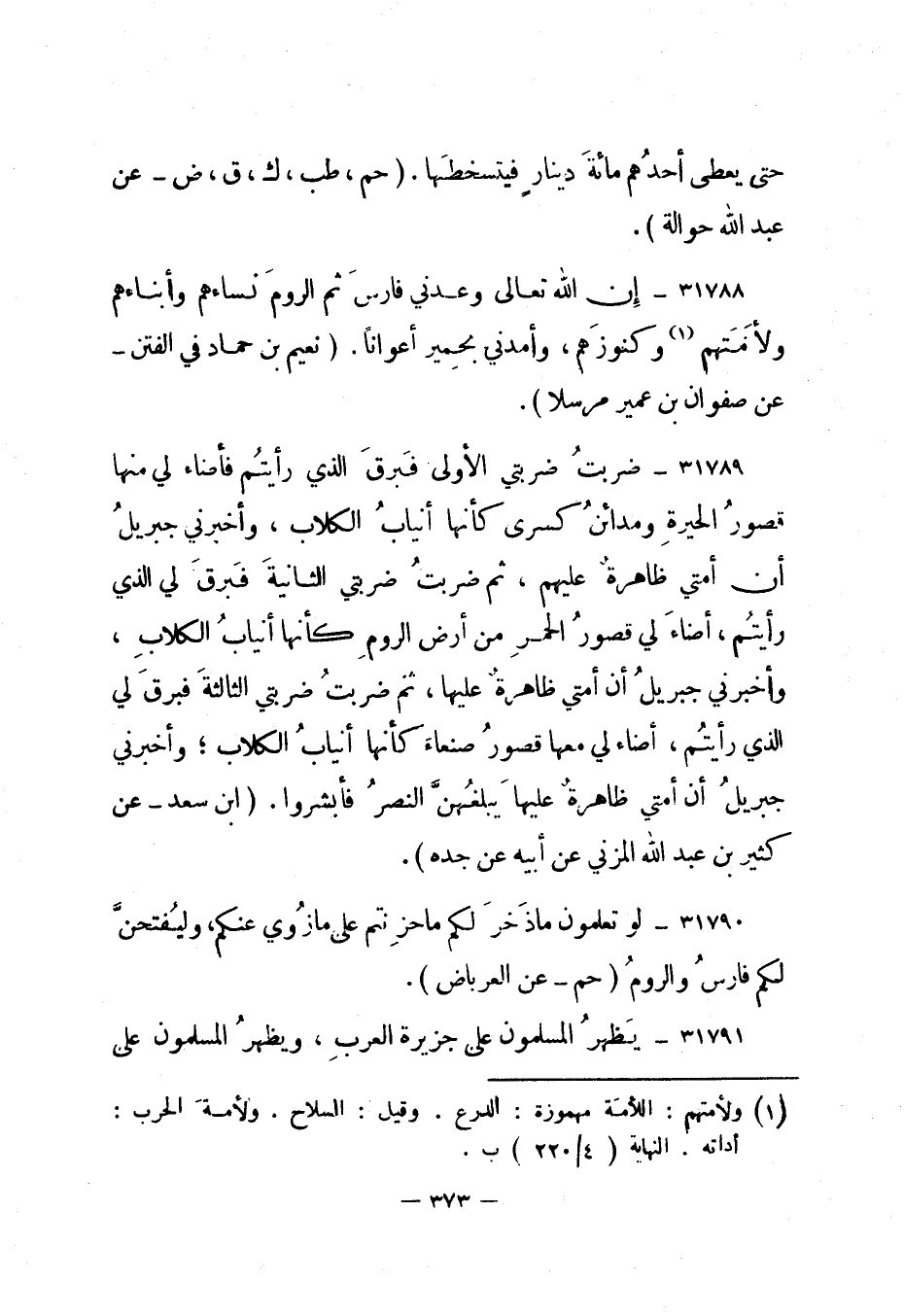 31789- ضربت ضربتي الأولى فبرق الذي رأيتم فأضاء لي منها قصور الحيرة ومدائن كسرى كأنها أنياب الكلاب، وأخبرني جبريل أن أمتي ظاهرة عليهم، ثم ضربت ضربتي الثانية فبرق لي الذي رأيتم، أضاء لي قصور الحمر من أرض الروم كأنها أنياب الكلاب، وأخبرني جبريل أن أمتي ظاهرة عليها، ثم ضربت ضربتي الثالثة فبرق لي الذي رأيتم، أضاء لي معها قصور صنعاء كأنها أنياب الكلاب؛ وأخبرني جبريل أن أمتي ظاهرة عليها يبلغهن النصر فأبشروا. "ابن سعد - عن كثير بن عبد الله المزني عن أبيه عن جده".