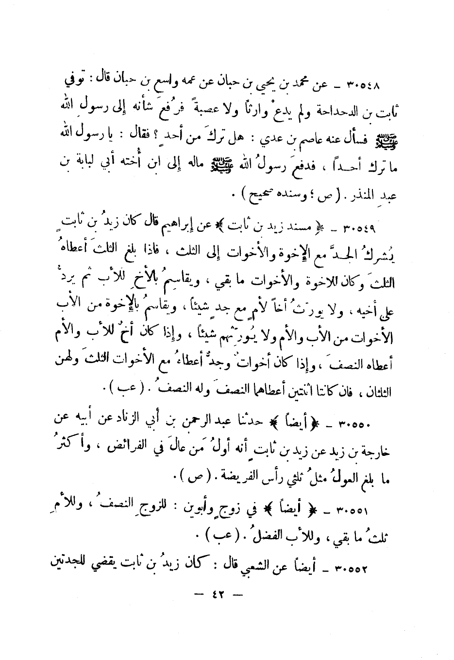 30549- "مسند زيد بن ثابت" عن إبراهيم قال كان زيد بن ثابت يشرك الجد مع الإخوة والأخوات إلى الثلث، فإذا بلغ الثلث أعطاه الثلث وكان للإخوة والأخوات ما بقي، ويقاسم بالأخ للأب ثم يرد على أخيه، ولا يورث أخا لأم مع جد شيئا، ويقاسم بالأخوة من الأب الأخوات من الأب والأم ولا يورثهم شيئا، وإذا كان أخ للأب والأم أعطاه النصف، وإذا كان أخوات وجد أعطاء مع الأخوات الثلث ولهن الثلثان، فإن كانتا اثنتين أعطاهما النصف وله النصف. "عب".