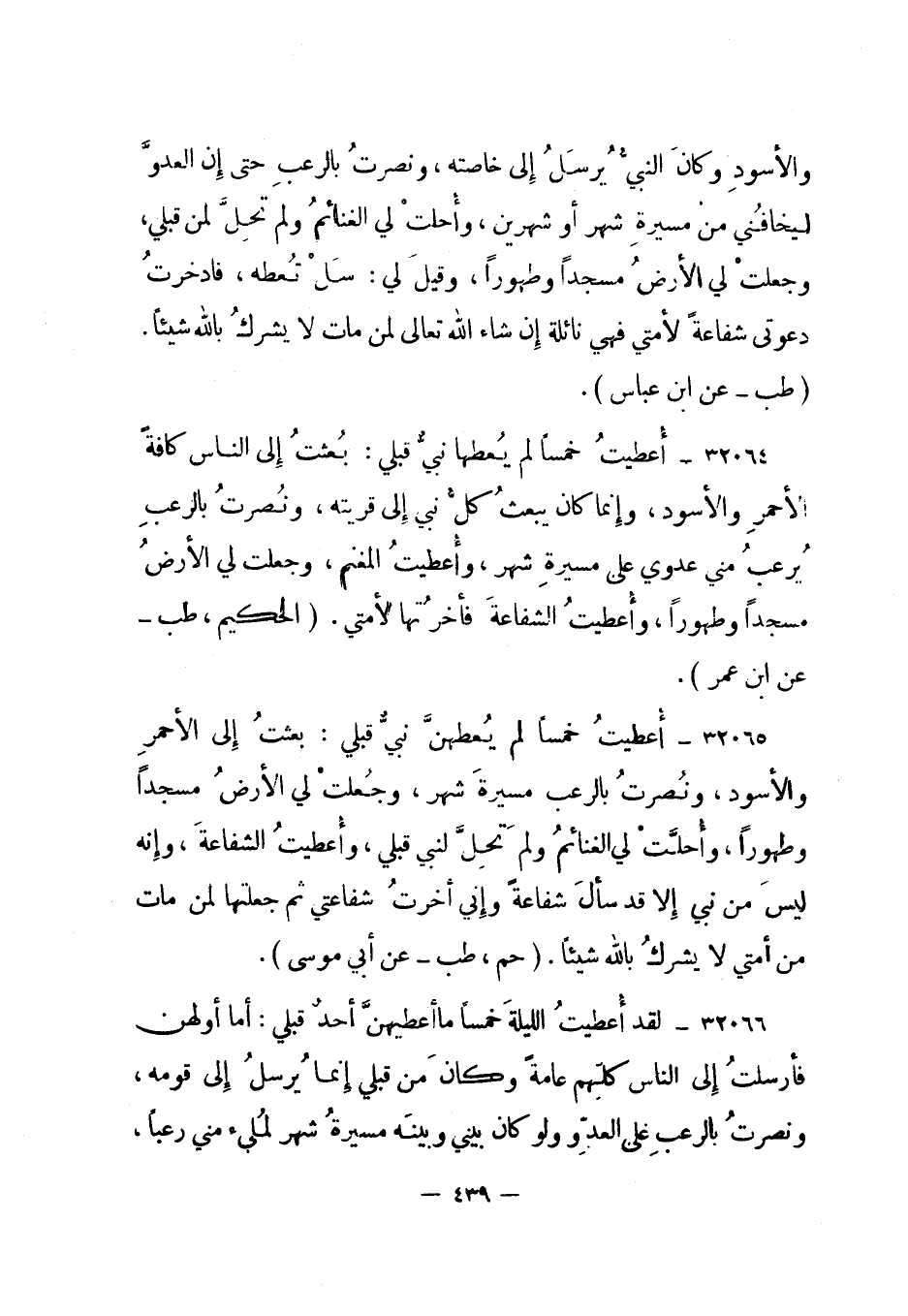32066- لقد أعطيت الليلة خمسا ما أعطيهن أحد قبلي: أما أولهن فأرسلت إلى الناس عامة وكان من قبلي إنما يرسل إلى قومه، ونصرت بالرعب على العدو ولو كان بيني وبينه مسيرة شهر لملئ مني رعبا،