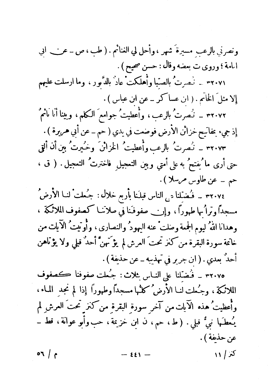 32075- فضلنا على الناس بثلاث: جعلت صفوفنا كصفوف الملائكة، وجعلت لنا الأرض كلها مسجدا وطهورا إذا لم نجد الماء، وأعطيت هذه الآيات من آخر سورة البقرة من كنز تحت العرش لم يعطها نبي قبلي. "ط، حم، ن ابن خزيمة، حب وأبو عوانة، قط - عن حذيفة".