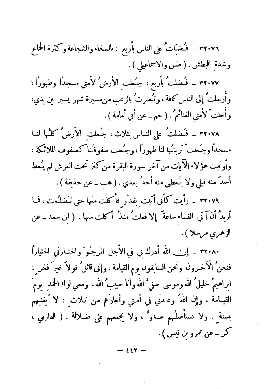 32077- فضلت بأربع: جعلت الأرض لأمتي مسجدا وطهورا، وأرسلت إلى الناس كافة، ونصرت بالرعب من مسيرة شهر يسير بين يدي، وأحلت لأمتي الغنائم. "حم - عن أبي أمامة".