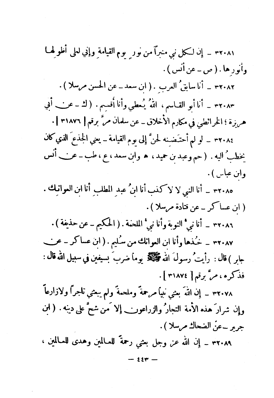 32081- إن لكل نبي منبرا من نور يوم القيامة وإني لعلى أطولها وأنورها. "ص - عن أنس".
