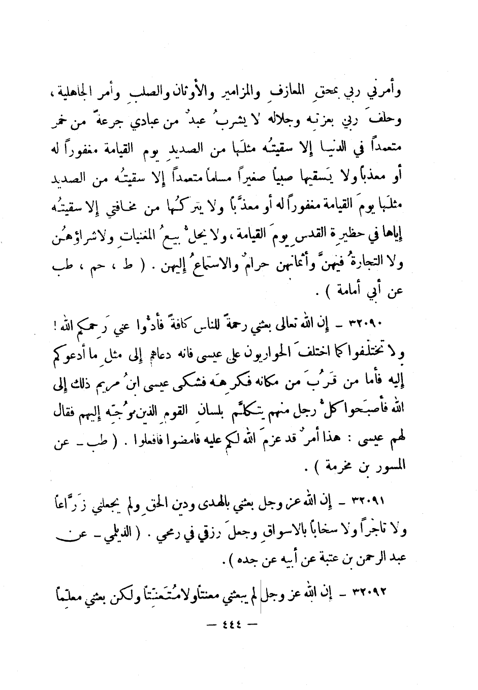 وأمرني ربي بمحق المعازف والمزامير والأوثان والصلب وأمر الجاهلية، وحلف ربي بعزته وجلاله لا يشرب عبد من عبادي جرعة من خمر متعمدا في الدنيا إلا سقيته مثلها من الصديد يوم القيامة مغفورا له أو معذبا ولا يسقيها صبيا صغيرا مسلما متعمدا إلا سقيته من الصديد مثلها يوم القيامة مغفورا له أو معذبا ولا يتركها من مخافتي إلا سقيته إياها في حظيرة القدس يوم القيامة، ولا يحل بيع المغنيات ولا شراؤهن ولا التجارة فيهن وأثمانهن حرام والاستماع إليهن. "ط، حم، طب عن أبي أمامة".