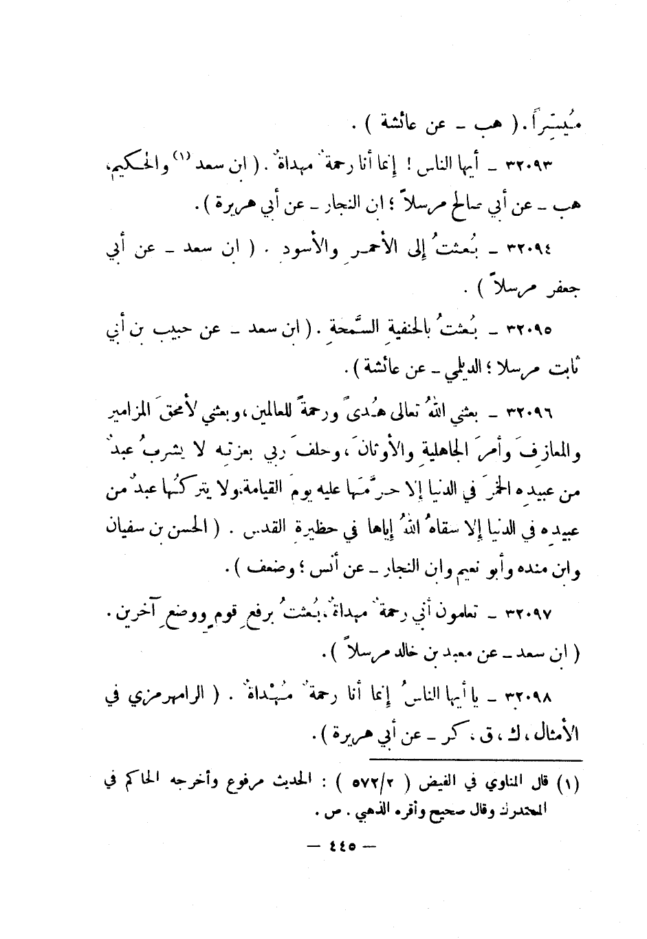 32093- أيها الناس! إنما أنا رحمة مهداة. "ابن سعد 1 والحكيم، هب - عن أبي صالح مرسلا؛ ابن النجار - عن أبي هريرة".