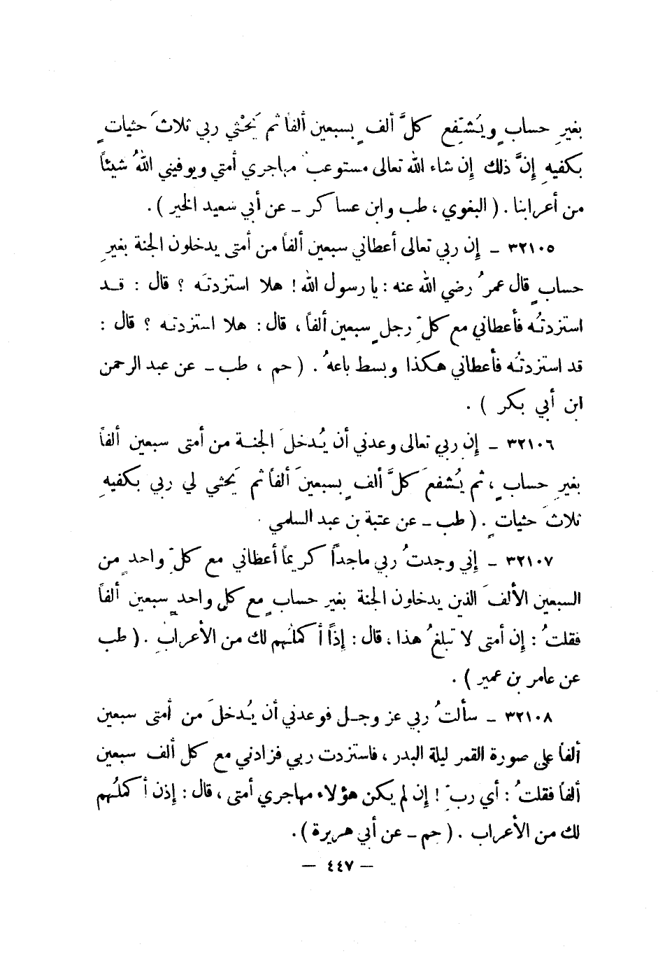 32105- إن ربي تعالى أعطاني سبعين ألفا من أمتي يدخلون الجنة بغير حساب قال عمر رضي الله عنه: يا رسول الله! هلا استزدته؟ قال: قد استزدته فأعطاني مع كل رجل سبعين ألفا، قال: هلا استزدته؟ قال: قد استزدته فأعطاني هكذا وبسط باعه. "حم، طب - عن عبد الرحمن ابن أبي بكر".