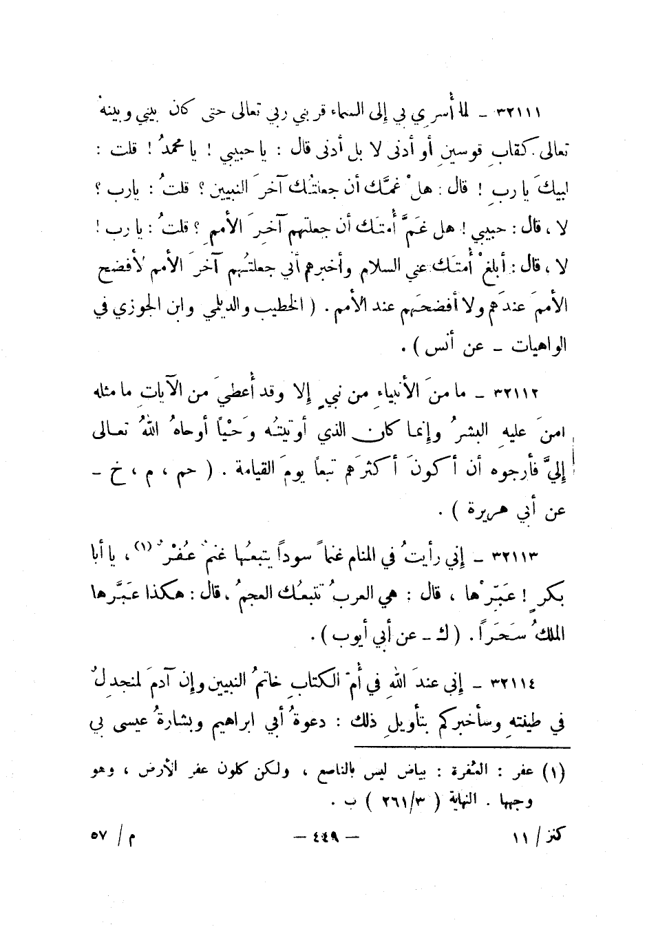 32113- إني رأيت في المنام غنما سودا يتبعها غنم عفر 1، يا أبا بكر! عبرها، قال: هي العرب تتبعك العجم، قال: هكذا عبرها الملك سحرا. "ك - عن أبي أيوب".