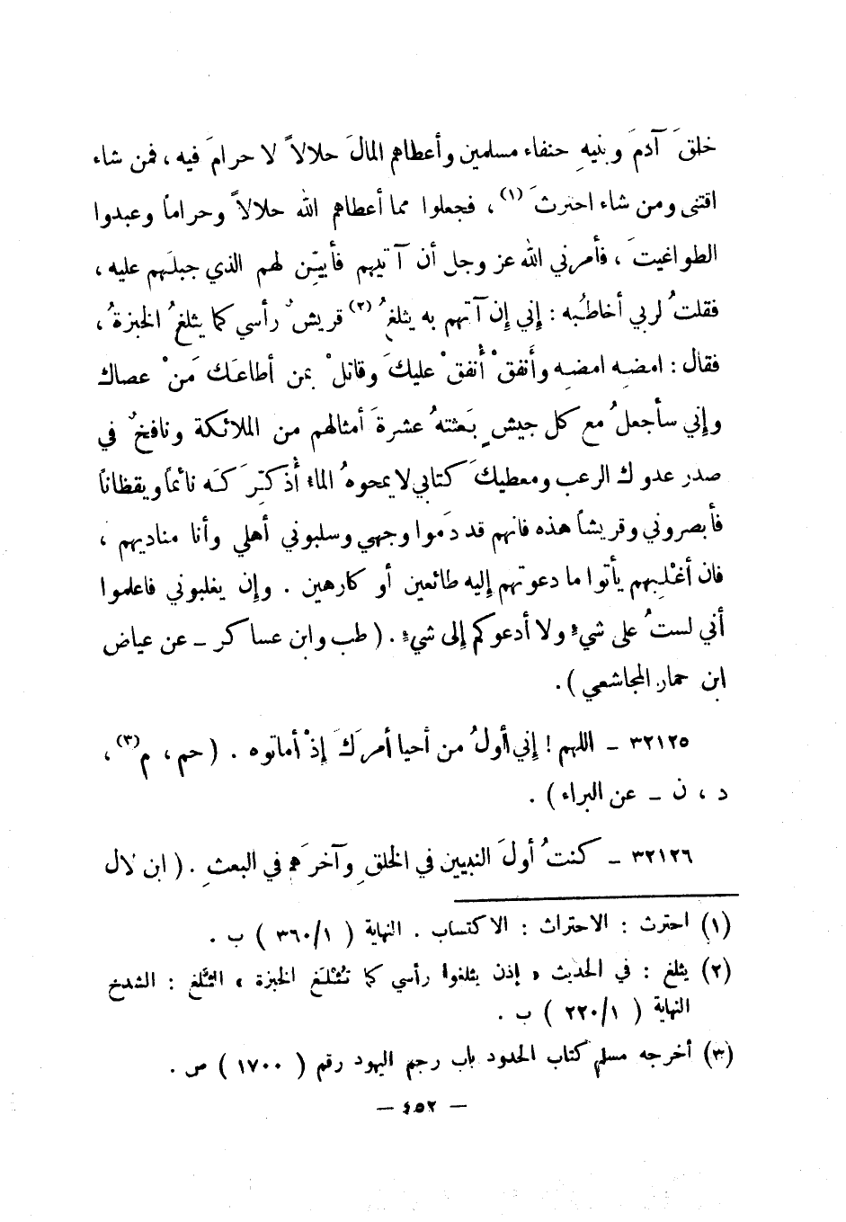 خلق آدم وبنيه حنفاء مسلمين وأعطاهم المال حلالا لا حرام فيه، فمن شاء اقتنى ومن شاء احترس 1، فجعلوا مما أعطاهم الله حلالا وحراما وعبدوا الطواغيت، فأمرني الله عز وجل أن آتيهم فأبين لهم الذي جبلهم عليه، فقلت لربي أخاطبه: إني إن آتهم به يثلغ 2 قريش رأسي كما يثلغ الخبزة، فقال: امضه امضه وأنفق أنفق عليك وقاتل بمن أطاعك من عصاك وإني سأجعل مع كل جيش بعثته عشرة أمثالهم من الملائكة ونافخ في صدر عدوك الرعب ومعطيك كتابي لا يمحوه الماء أذكركه نائما ويقظانا فأبصروني وقريشا هذه فإنهم قد دموا وجهي وسلبوني أهلي وأنا مناديهم، فإن أغلبهم يأتوا ما دعوتهم إليه طائعين أو كارهين، وإن يغلبوني فاعلموا أني لست على شيء ولا أدعوكم إلى شيء. "طب وابن عساكر - عن عياض ابن حمار المجاشعي".