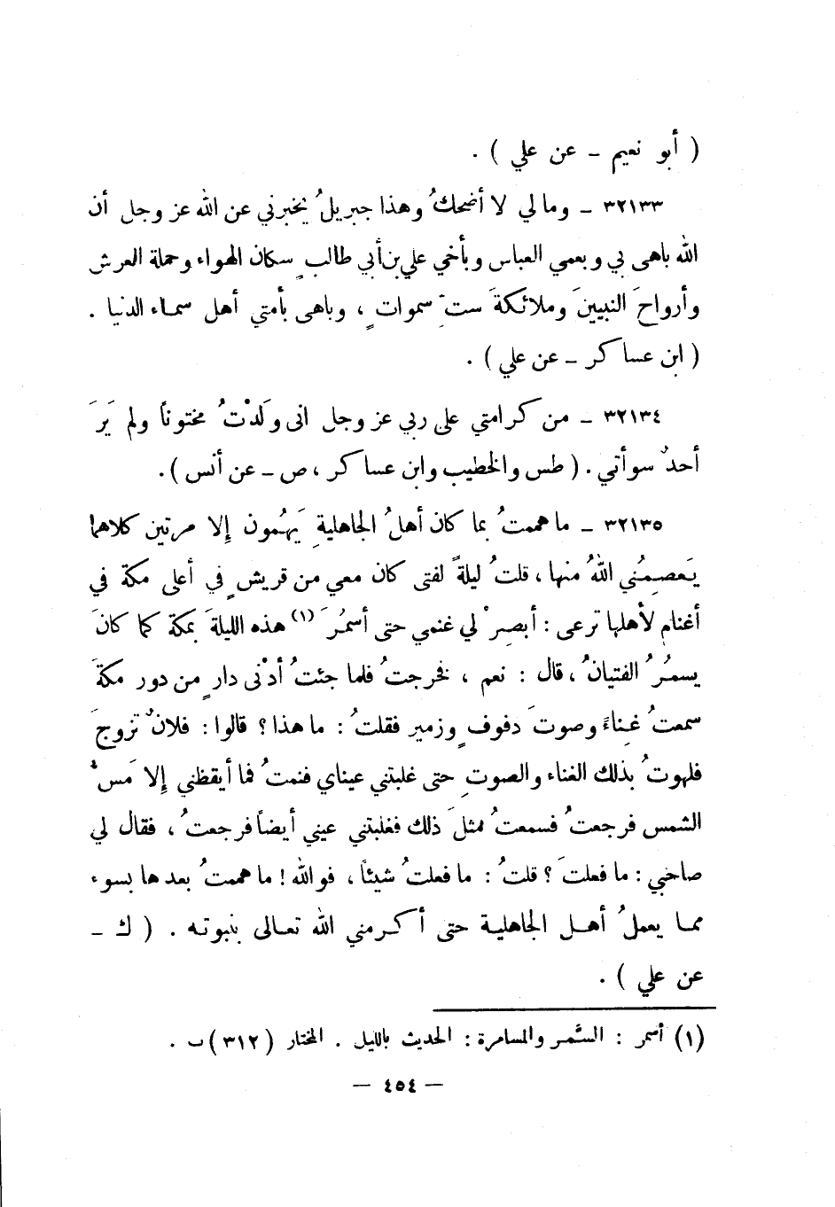 32135- ما هممت بما كان أهل الجاهلية يهمون إلا مرتين كلاهما يعصمني الله منها، قلت ليلة لفتى كان معي من قريش في أعلى مكة في أغنام لأهلها ترعى: أبصر لي غنمي حتى أسمر 1 هذه الليلة بمكة كما كان يسمر الفتيان، قال: نعم، فخرجت فلما جئت أدنى دار من دور مكة سمعت غناء وصوت دفوف وزمير فقلت: ما هذا؟ قالوا: فلان تزوج فلهوت بذلك الغناء والصوت حتى غلبتني عيناي فنمت فما أيقظني إلا مس الشمس فرجعت فسمعت مثل ذلك فغلبتني عيني أيضا فرجعت، فقال لي صاحبي: ما فعلت؟ قلت: ما فعلت شيئا، فوالله! ما هممت بعدها بسوء مما يعمل أهل الجاهلية حتى أكرمني الله تعالى بنبوته. "ك - عن علي".