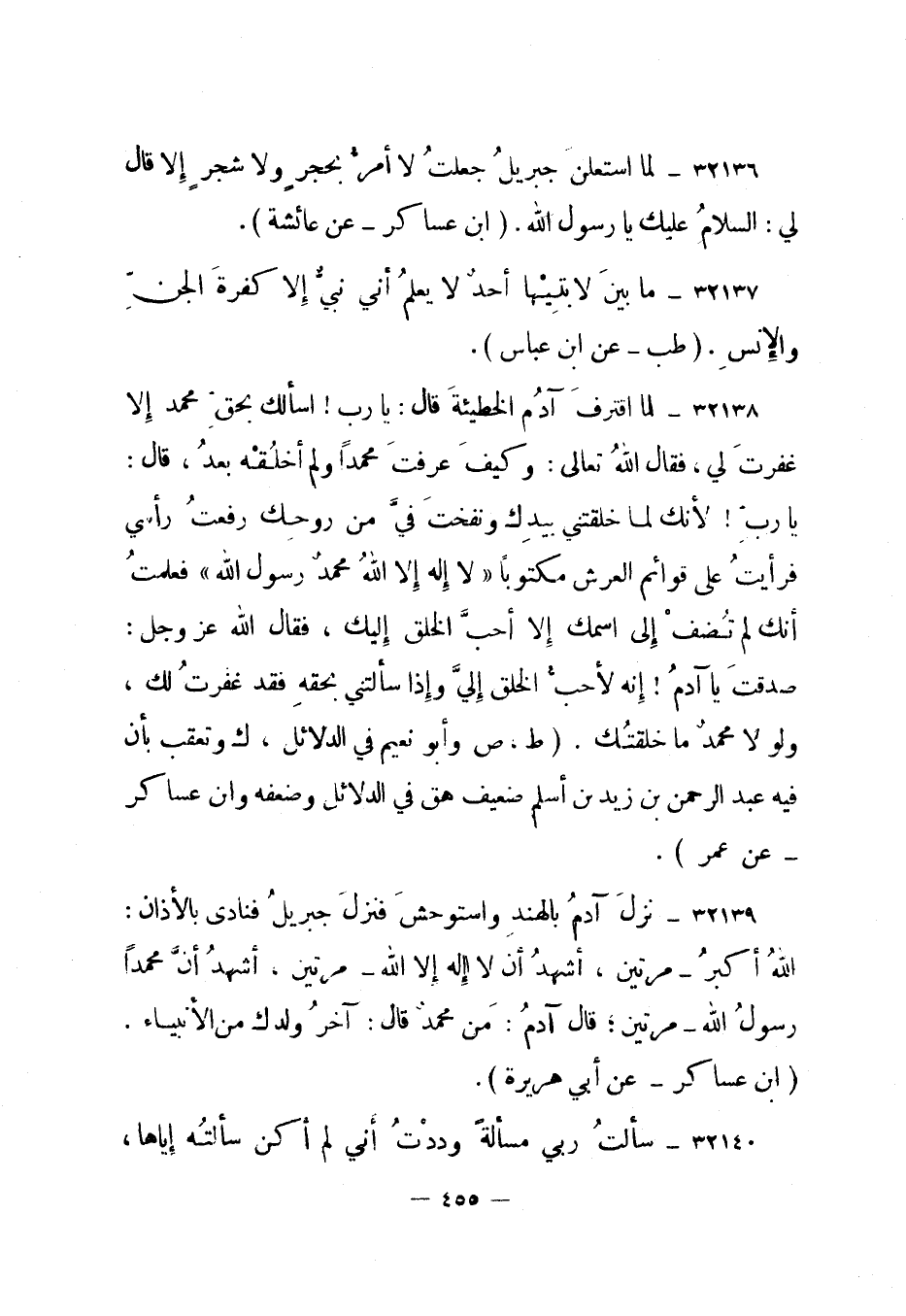 32139- نزل آدم بالهند واستوحش فنزل جبريل فنادى بالأذان: الله أكبر - مرتين، أشهد أن لا إله إلا الله - مرتين، أشهد أن محمدا رسول الله - مرتين؛ قال آدم: من محمد قال: آخر ولدك من الأنبياء. "ابن عساكر - عن أبي هريرة".