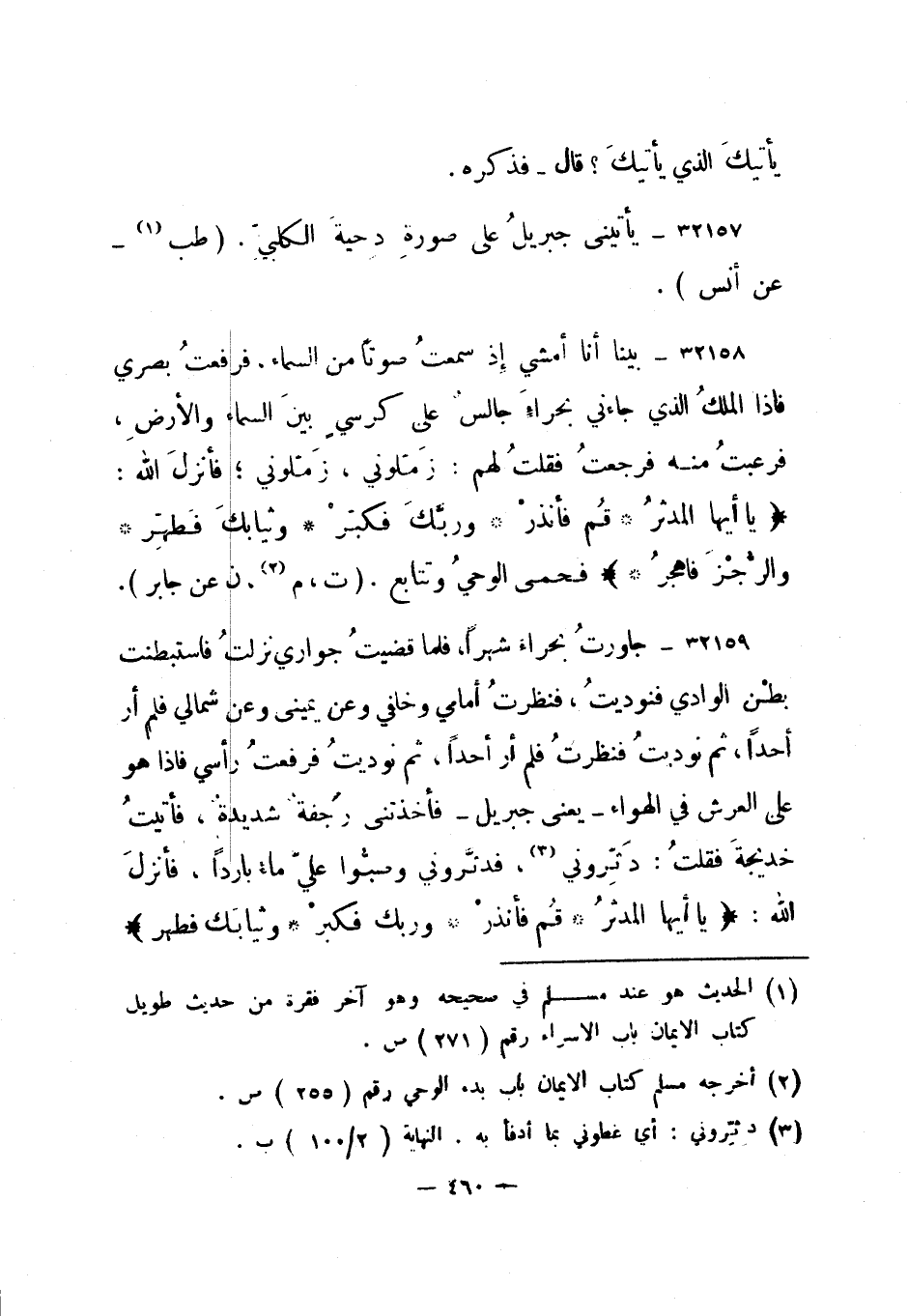 32159- جاورت بحراء شهرا، فلما قضيت جواري نزلت فاستنبطت بطن الوادي فنوديت، فنظرت أمامي وخلفي وعن يميني وعن شمالي فلم أر أحدا، ثم نوديت فنظرت فلم أر أحدا، ثم نوديت فرفعت رأسي فإذا هو على العرش في الهواء - يعني جبريل - فأخذتني رجفة شديدة، فأتيت خديجة فقلت: دثروني 3، فدثروني وصبوا علي ماء باردا، فأنزل الله: {يَا أَيُّهَا الْمُدَّثِّرُ قُمْ فَأَنْذِرْ وَرَبَّكَ فَكَبِّرْ وَثِيَابَكَ فَطَهِّرْ} .