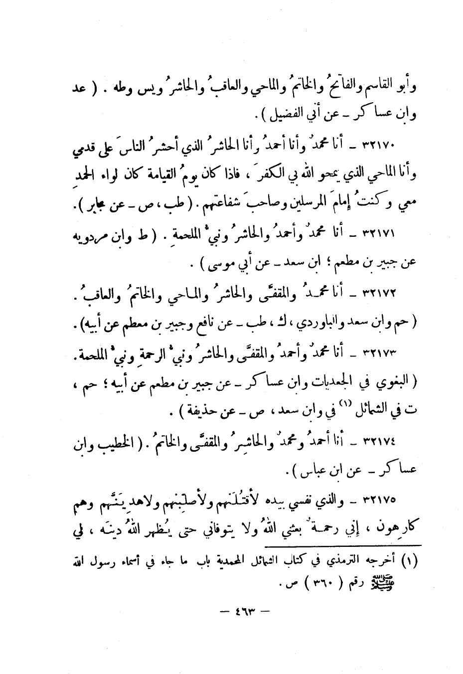 32174- أنا أحمد ومحمد والحاشر والمقفى والخاتم. "الخطيب وابن عساكر - عن ابن عباس".