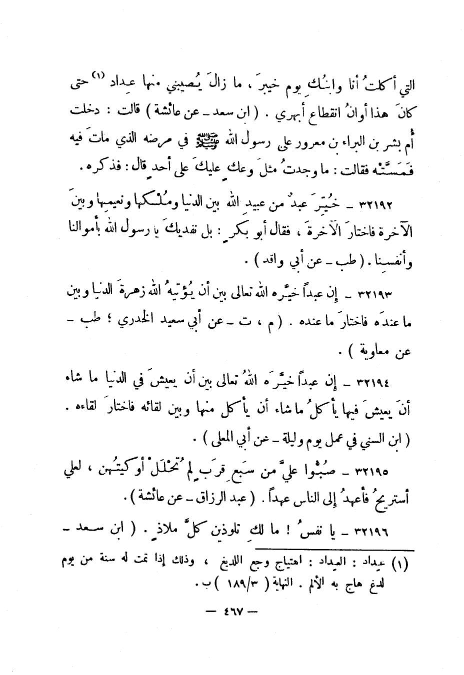 32194- إن عبدا خيره الله تعالى بين أن يعيش في الدنيا ما شاء أن يعيش فيها يأكل ما شاء أن يأكل منها وبين لقائه فاختار لقاءه. "ابن السني في عمل يوم وليلة - عن أبي المعلى".