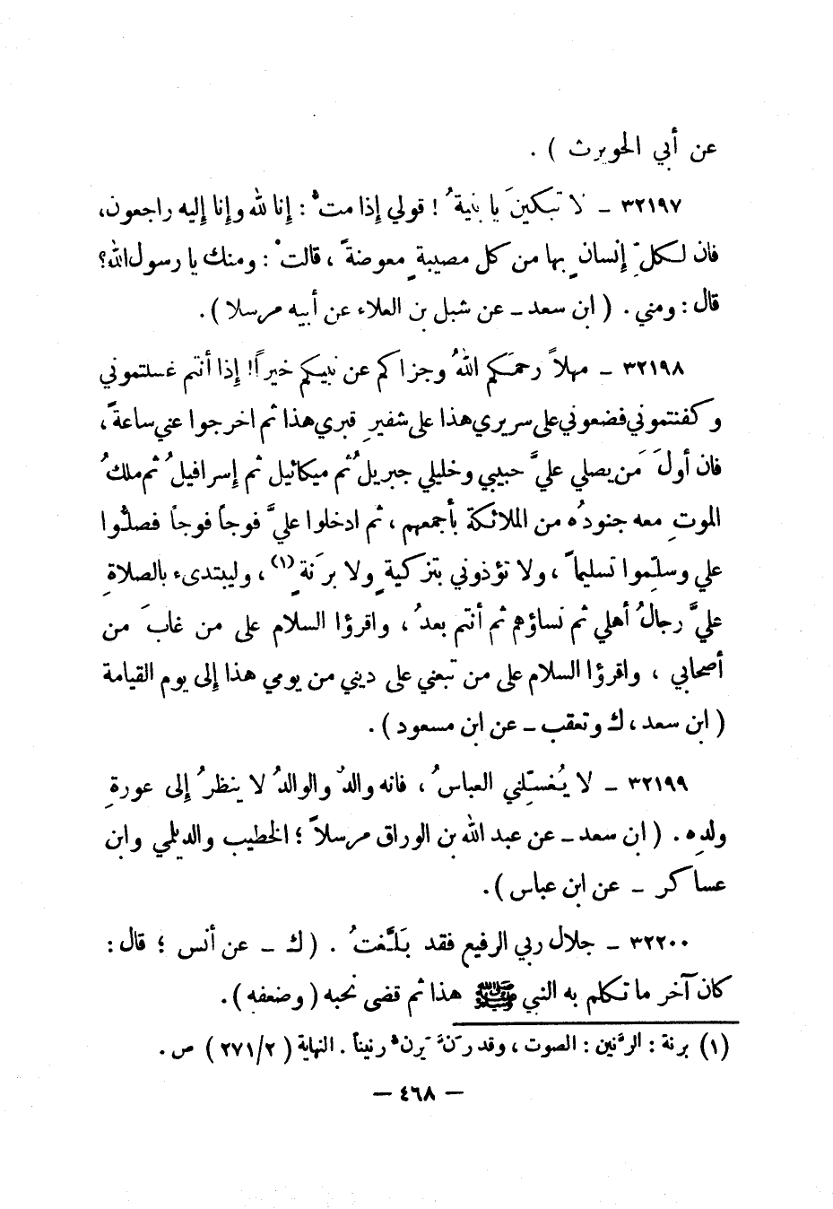 32198- مهلا رحمكم الله وجزاكم عن نبيكم خيرا! إذا أنتم غسلتموني وكفنتموني فضعوني على سريري هذا على شفير قبري هذا ثم اخرجوا عني ساعة، فإن أول من يصلي علي حبيبي وخليلي جبريل ثم ميكائيل ثم إسرافيل ثم ملك الموت معه جنوده من الملائكة بأجمعهم، ثم ادخلوا علي فوجا فوجا فصلوا علي وسلموا تسليما، ولا تؤذوني بتزكية ولا برنة 1، وليبتدئ بالصلاة علي رجال أهلي ثم نساؤهم ثم أنتم بعد، واقرؤا السلام على من غاب من أصحابي، واقرؤا السلام على من تبعني على ديني من يومي هذا إلى يوم القيامة. "ابن سعد، ك وتعقب - عن ابن مسعود".