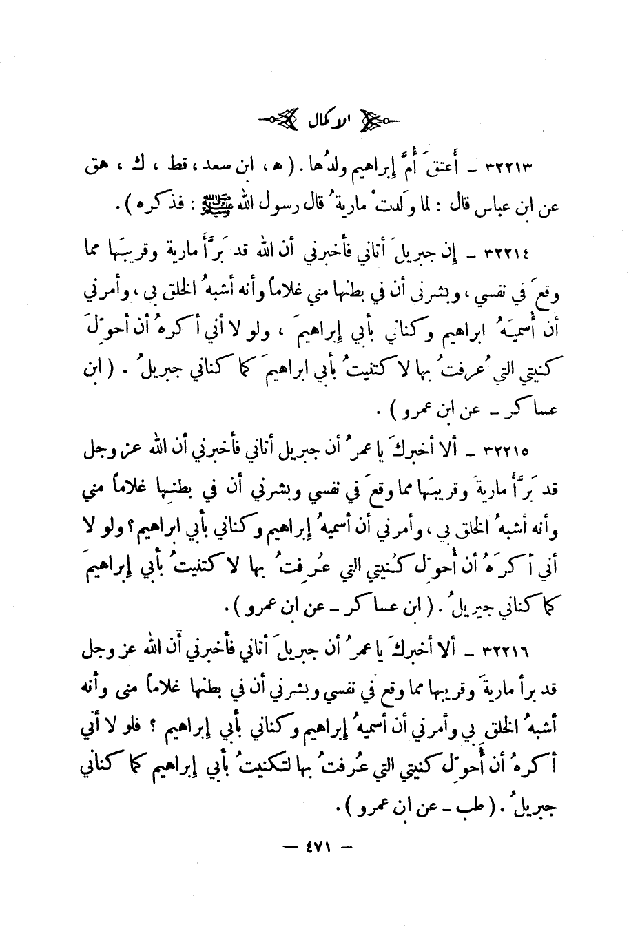32215- ألا أخبرك يا عمر أن جبريل أتاني فأخبرني أن الله عز وجل قد برأ مارية وقريبها مما وقع في نفسي وبشرني أن في بطنها غلاما مني وأنه أشبه الخلق بي، وأمرني أن أسميه إبراهيم وكناني بأبي إبراهيم؟ ولولا أني أكره أن أحول كنيتي التي عرفت بها لاكتنيت بأبي إبراهيم كما كناني جبريل. "ابن عساكر - عن ابن عمرو".
