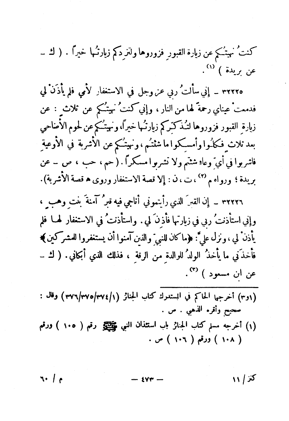 32226- إن القبر الذي رأيتموني أناجي فيه قبر آمنة بنت وهب، وإني استأذنت ربي في زيارتها فأذن لي. واستأذنت في الاستغفار لها فلم يأذن لي، ونزل علي: {مَا كَانَ لِلنَّبِيِّ وَالَّذِينَ آمَنُوا أَنْ يَسْتَغْفِرُوا لِلْمُشْرِكِينَ} فأخذني ما يأخذ الولد للوالدة من الرقة، فذلك الذي أبكاني. "ك - عن ابن مسعود"1.
