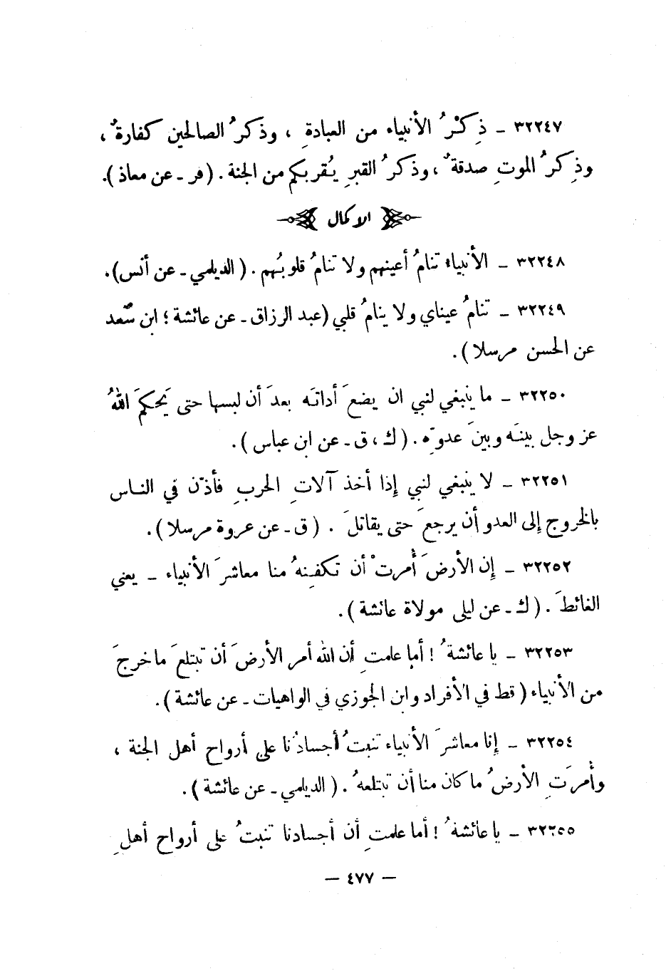 32249- تنام عيناي ولا ينام قلبي. "عبد الرزاق - عن عائشة؛ ابن سعد عن الحسن مرسلا".