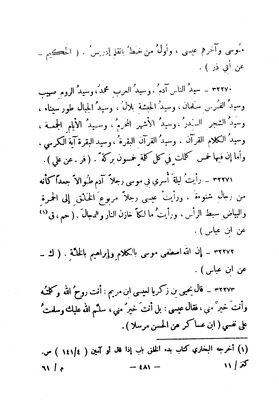 32273- قال يحيى بن زكريا لعيسى ابن مريم: أنت روح الله وكلمته وأنت خير مني، فقال عيسى: بل أنت خير مني، سلم الله عليك وسلمت على نفسي. "ابن عساكر عن الحسن مرسلا".
