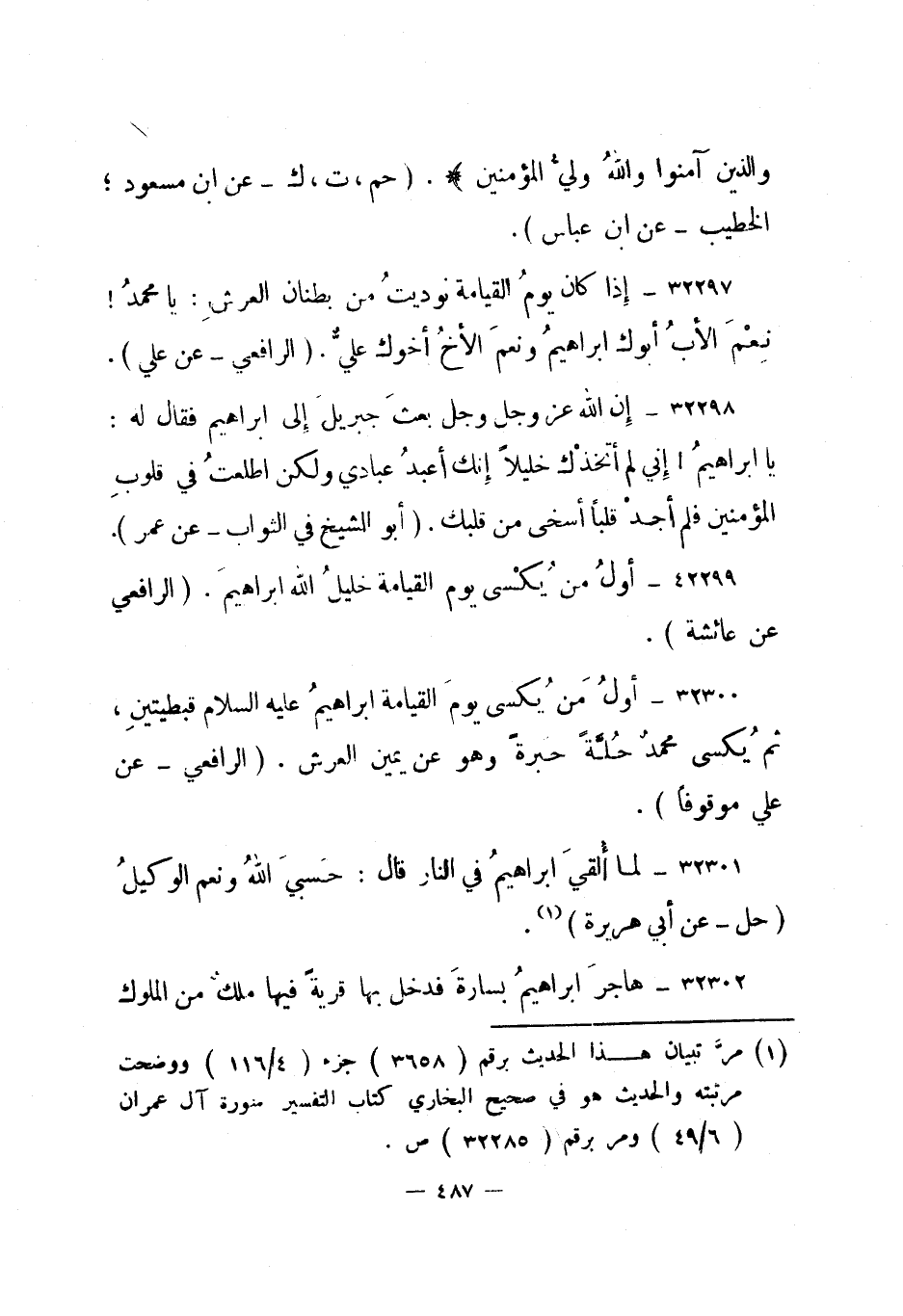 32299- أول من يكسى يوم القيامة خليل الله إبراهيم. "الرافعي عن عائشة".