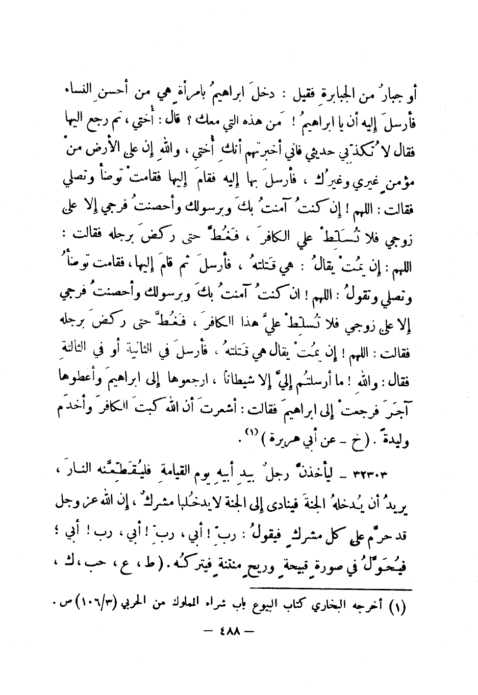 أو جبار من الجبابرة فقيل: دخل إبراهيم بامرأة هي من أحسن النساء فأرسل إليه أن يا إبراهيم! من هذه التي معك؟ قال: أختي، ثم رجع إليها فقال لا تكذبي حديثي فإني أخبرتهم أنك أختي، والله إن على الأرض من مؤمن غيري وغيرك، فأرسل بها إليه فقام إليها فقامت توضأ وتصلي فقالت: اللهم! إن كنت آمنت بك وبرسولك وأحصنت فرجي إلا على زوجي فلا تسلط علي الكافر، فغط حتى ركض برجله فقالت: اللهم: إن يمت يقال: هي قتلته، فأرسل ثم قام إليها، فقامت توضأ وتصلي وتقول: اللهم! إن كنت آمنت بك وبرسولك وأحصنت فرجي إلا على زوجي فلا تسلط علي هذا الكافر، فغط حتى ركض برجله فقالت: اللهم! إن يمت يقال هي قتلته، فأرسل في الثانية أو في الثالثة فقال: والله! ما أرسلتم إلي إلا شيطانا، ارجعوها إلى إبراهيم وأعطوها آجر فرجعت إلى إبراهيم فقالت: أشعرت أن الله كبت الكافر وأخدم وليدة. "خ - عن أبي هريرة"1.