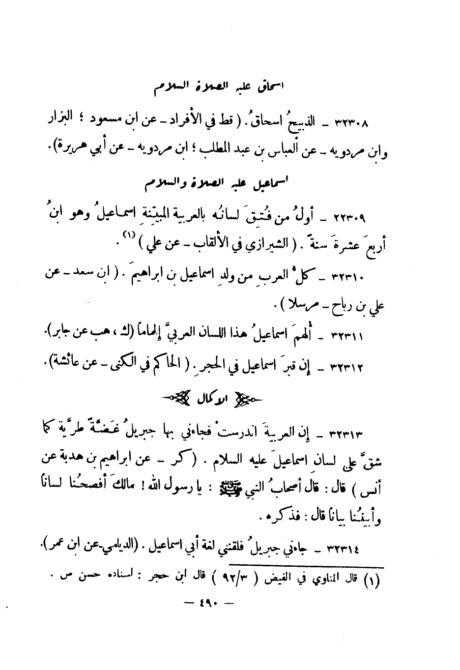 32309- أول من فتق لسانه بالعربية المبينة إسماعيل وهو ابن أربع عشرة سنة. "الشيرازي في الألقاب - عن علي"1.