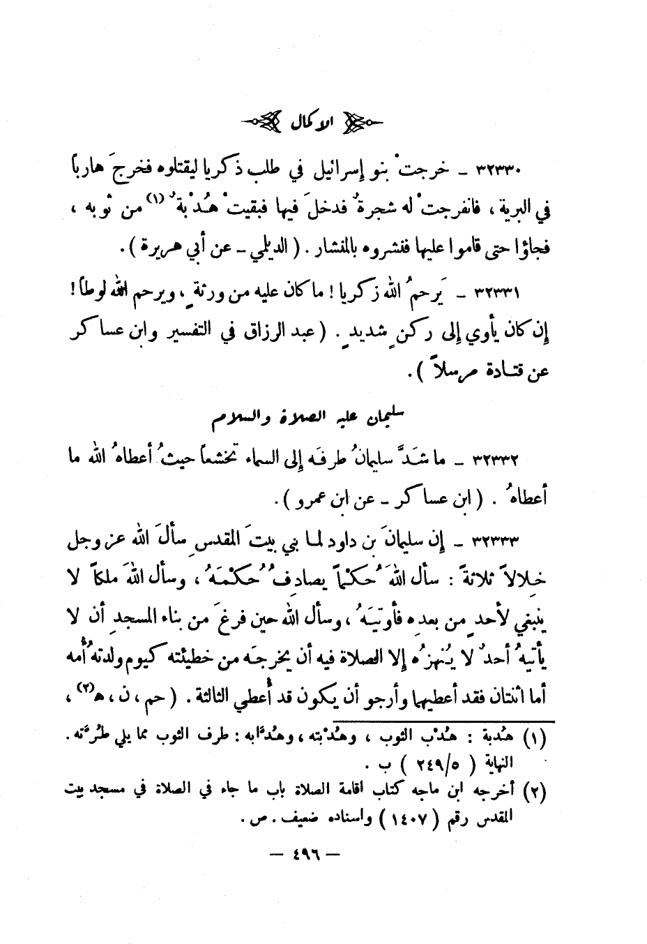 32333- إن سليمان بن داود لما بني بيت المقدس سأل الله عز وجل خلالا ثلاثة: سأل الله حكما يصادف حكمه، وسأل الله ملكا لا ينبغي لأحد من بعده فأوتيه، وسأل الله حين فرغ من بناء المسجد أن لا يأتيه أحد لا ينهزه إلا الصلاة فيه أن يخرجه من خطيئته كيوم ولدته أمه أما اثنتان فقد أعطيهما وأرجو أن يكون قد أعطي الثالثة. "حم، ن، هـ 2،