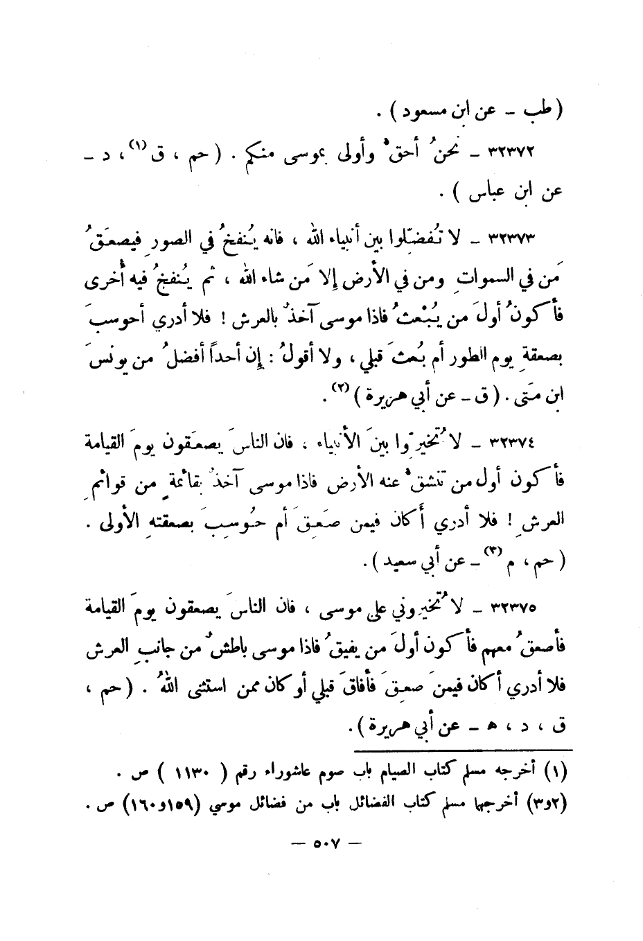 32373- لا تفضلوا بين أنبياء الله، فإنه ينفخ في الصور فيصعق من في السموات ومن في الأرض إلا من شاء الله، ثم ينفخ فيه أخرى فأكون أول من يبعث فإذا موسى آخذ بالعرش! فلا أدري أحوسب بصعقة يوم الطور أم بعث قبلي، ولا أقول: إن أحدا أفضل من يونس ابن متى. "ق - عن أبي هريرة"2.