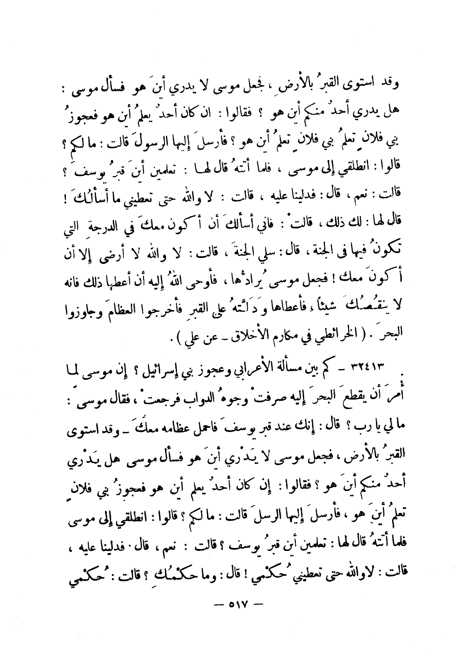 32413- كم بين مسألة الأعرابي وعجوز بني إسرائيل؟ إن موسى لما أمر أن يقطع البحر إليه صرفت وجوه الدواب فرجعت، فقال موسى: ما لي يا رب؟ قال: إنك عند قبر يوسف فاحمل عظامه معك - وقد استوى القبر بالأرض، فجعل موسى لا يدري أين هو فسأل موسى هل يدري أحد منكم أين هو؟ فقالوا: إن كان أحد يعلم أين هو فعجوز بني فلان تعلم أين هو، فأرسل إليها الرسل قالت: ما لكم؟ قالوا: انطلقي إلى موسى فلما أتته قال لها: تعلمين أين قبر يوسف؟ قالت: نعم، قال: فدلينا عليه، قالت: لا والله حتى تعطيني حكمي! قال: وما حكمك؟ قالت: حكمي