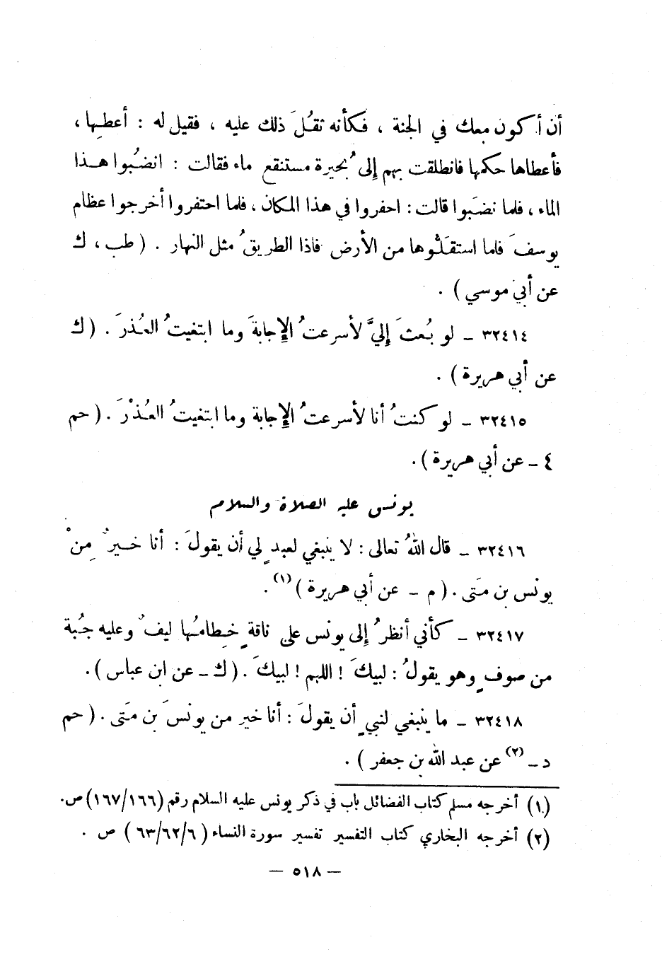 32418- ما ينبغي لنبي أن يقول: أنا خير من يونس بن متى. "حم د - 2 عن عبد الله بن جعفر".