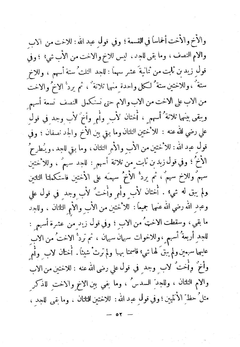 والأخ والأخت أخماسا في القسمة؛ وفي قول عبد الله: للأخت من الأب والأم النصف، وما بقي للجد، ليس للأخ والأخت من الأب شيء؛ وفي قول زيد بن ثابت من ثمانية عشر سهما: للجد الثلث ستة أسهم، وللأخ ستة، وللأختين ستة لكل واحدة منهما ثلاثة، ثم يرد الأخ والأخت من الأب على الأخت من الأب والأم حتى تستكمل النصف تسعة أسهم ويبقى بينهما ثلاثة أسهم، أختان لأب وأم وأخ لأب وجد في قول علي رضي الله عنه: للأختين الثلثان وما بقي بين الأخ والجد نصفان؛ وفي قول عبد الله: للأختين من الأب والأم الثلثان، وما بقي للجد، ويطرح الأخ؛ وفي قول زيد بن ثابت من ثلاثة أسهم: للجد سهم، وللأختين سهم وللأخ سهم، ثم يرد الأخ سهمه على الأختين فاستكملتا الثلثين ولم يبق له شيء. أختان لأب وأم وأخت لأب وجد في قول علي وعبد الله رضي الله عنهما جميعا: للأختين من الأب والأم الثلثان، وللجد ما بقي، وسقطت الأخت من الأب؛ وفي قول زيد من عشرة أسهم: للجد أربعة أسهم، وللإخوات سهمان سهمان، ثم ترد الأخت من الأب عليهما سهمين ولم يبق لها شيء قاسمتا بها ولم ترث شيئا. أختان لأب وأم وأخ وأخت لأب وجد في قول علي رضي الله عنه: للأختين من الأب والأم الثلثان، وللجد السدس، وما بقي بين الأخ والأخت للذكر مثل حظ الأنثيين؛ وفي قول عبد الله: للأختين الثلثان، وما بقي للجد،