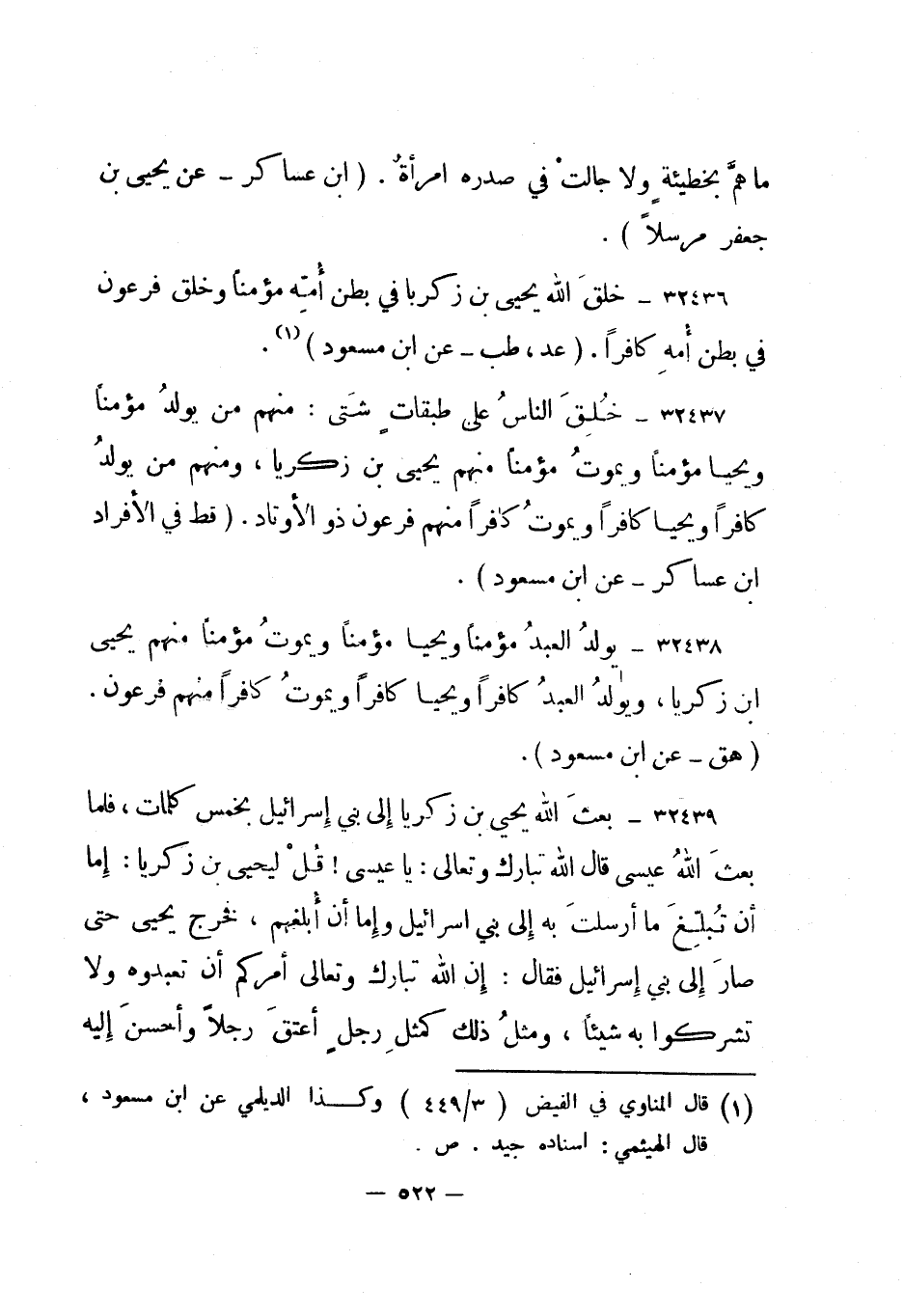 32436- خلق الله يحيى بن زكريا في بطن أمه مؤمنا وخلق فرعون في بطن أمه كافرا. "عد، طب - عن ابن مسعود"1.